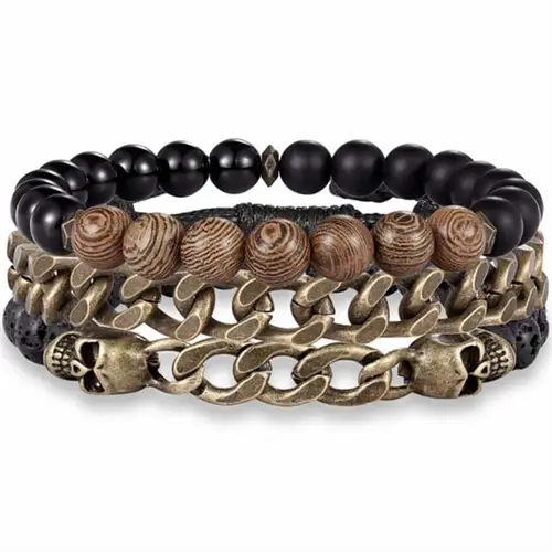 3 stk armbånd samlet med 8mm perler og bronze skulls. Super flot armbånd sæt i str. 19-21 cm