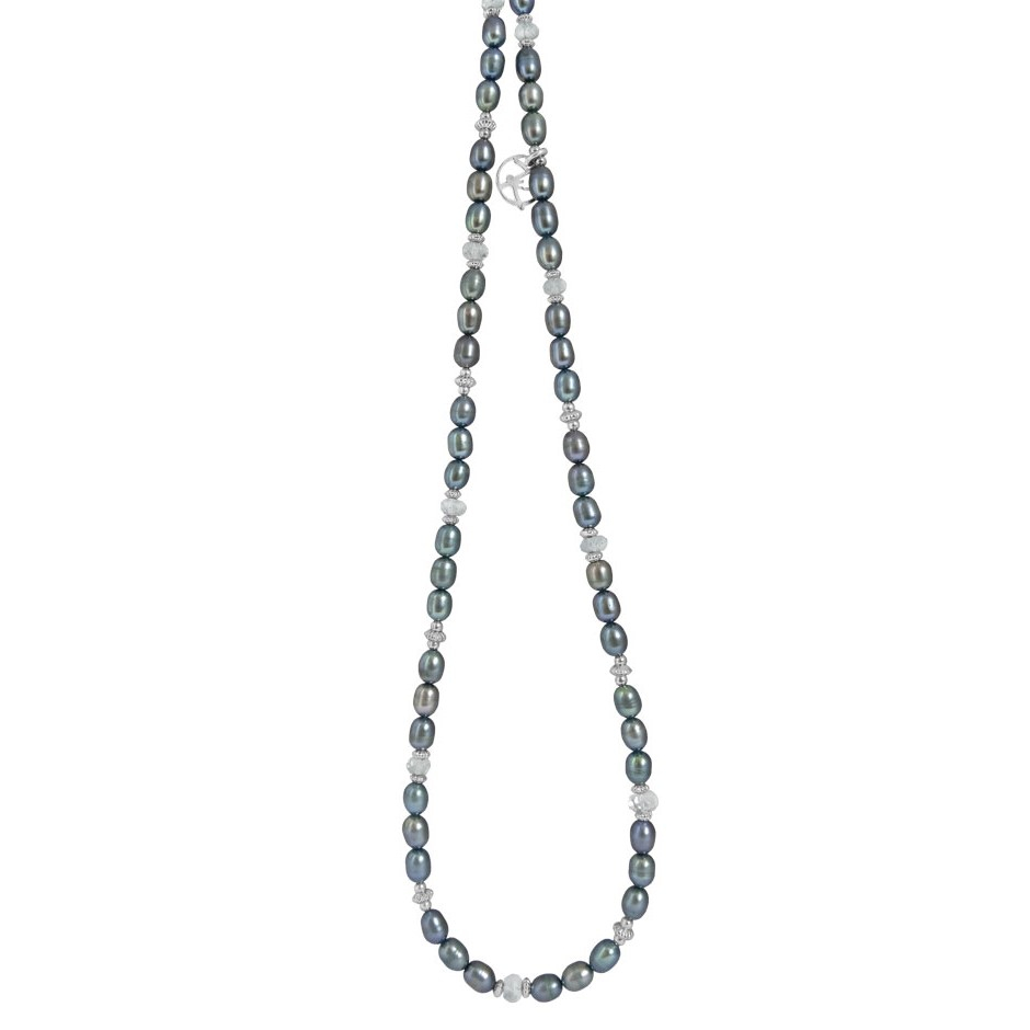Halskæde sterlingsølv. Grønne ferskvandsperler og aquamarin fra serien Colony fra Rabinovich smykker – Længde 45 cm.