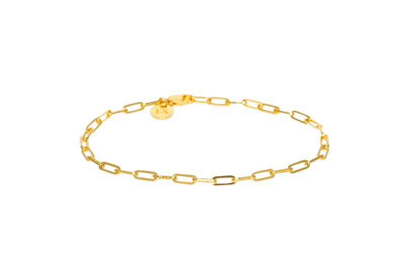 Armbåndets rå lænker trækker tydeligere referencer til kæden på et anker. Smykket måler 2mm i bredden. Smykket er fremstillet i 100 recycled 22 karat guldbelagt 925 sterling sølv. Alle vores smykker er stemplet med 925 IX indvendigt. Som