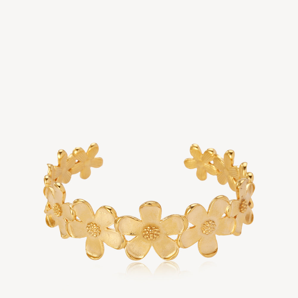 Camellia – Armbånd Forgyldt Camellia-armbåndets romantiske blomsterdesign er skabt til, at give din stil et frisk pust af yndig elegance. De er perfekte til et personligt feminint look og passer til enhver lejlighed. Mål. 60 ×40 mm Materiale. 18kt. Guldbela