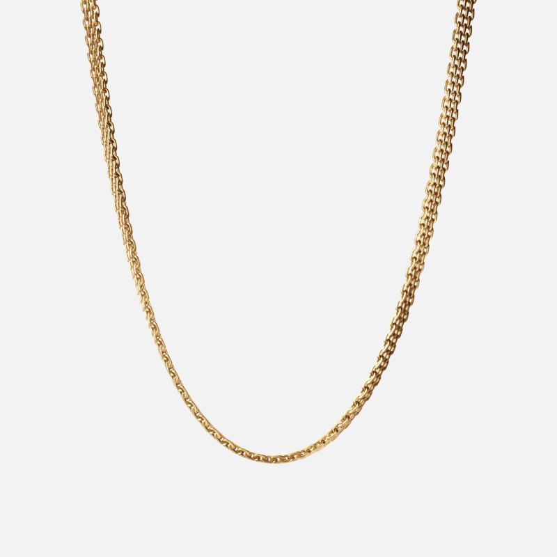 Den gyldne Mesh halskæde. Inspireret af månens elegante stråler. Smyger sig fint om halsen med sine flettede led. Den skaber et tidløst udtryk af raffinement. Der passer perfekt til enhver lejlighed