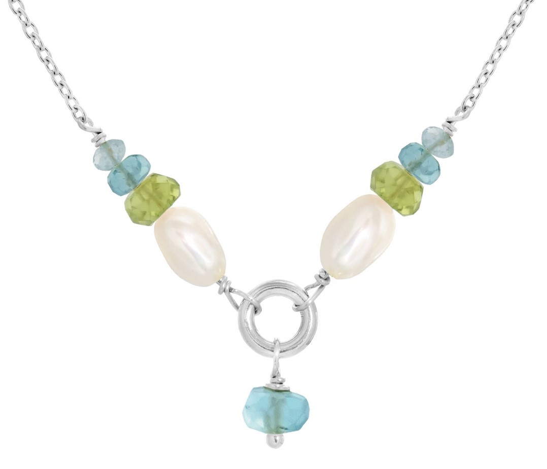 Sterlingsølv halskæde med hvide ferskvandsperler. Peridot. Rainbow månesten og labradorit. Halskæden er fra Rabinovich smykker fra serien Cordelia – Længde 4245 cm.