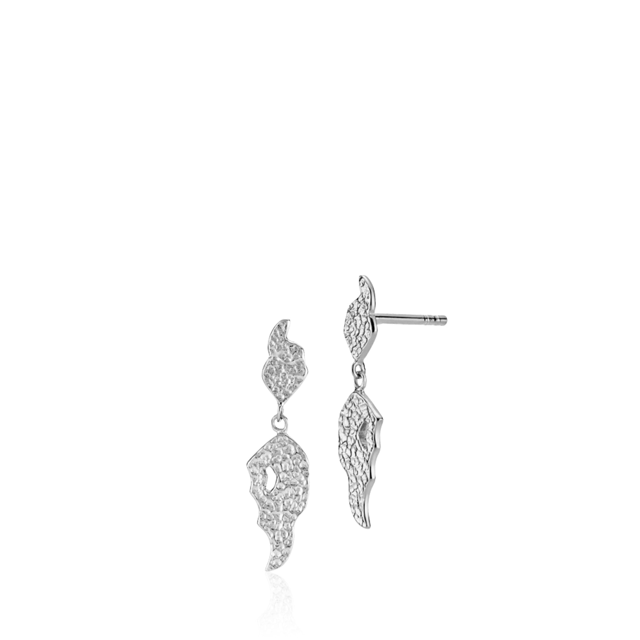 Sølv øreringe med organiske former og bølget overflade. Disse fine Matti ørestikkere er designet i genbrugssølv. Hvor den nederste del hænger løst og let under ørestikken. Matti kollektionen består af både ørestikkere. Kreoler og lange øreringe med kæde.