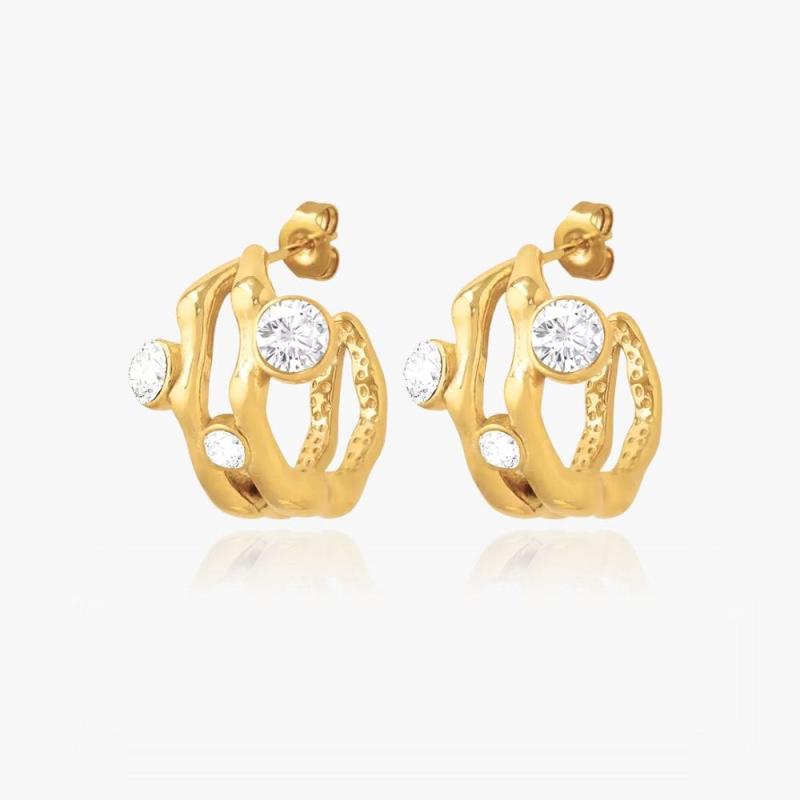 Materiale. Rustfrit stål. Farve. 18K Guldbelagt. Beskrivelse. Vores unikt designede Tekstur Krystal guld Øreringe. Der er 18K guldbelagte og har en strålende PVD-belægning. Et perfekt valg til, at tilføje elegance og glamour til enhver lejlighed.