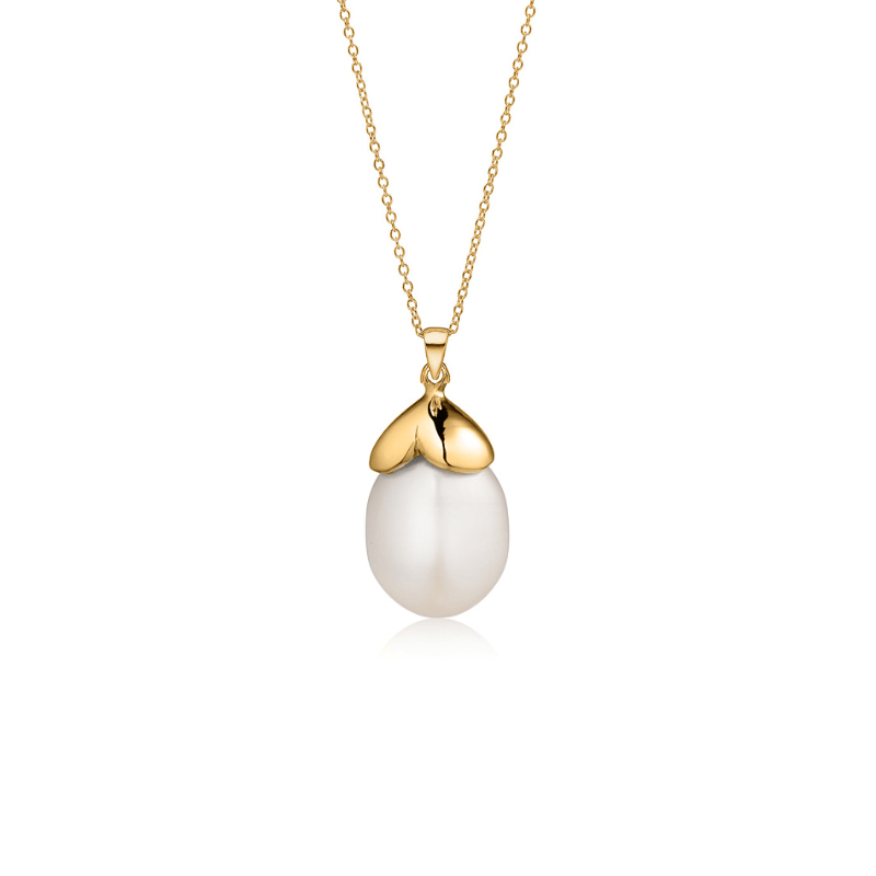 Smuk vedhæng i forgyldt sølv med fin zirkonia og smuk hvid ferskvandskulturperle.